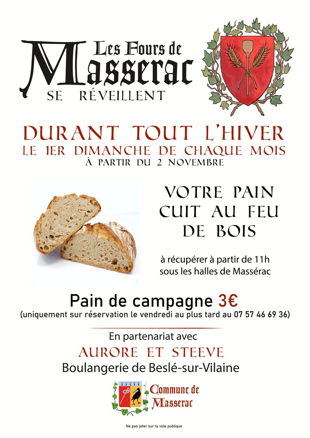 Tous les 1er dimanche du mois, l'association des Fours de Massérac vous propose du pain cuit au feu de bois 🔥. À venir récupérer entre 11h00 et 13h00 au four communal à côté de la salle des fêtes.