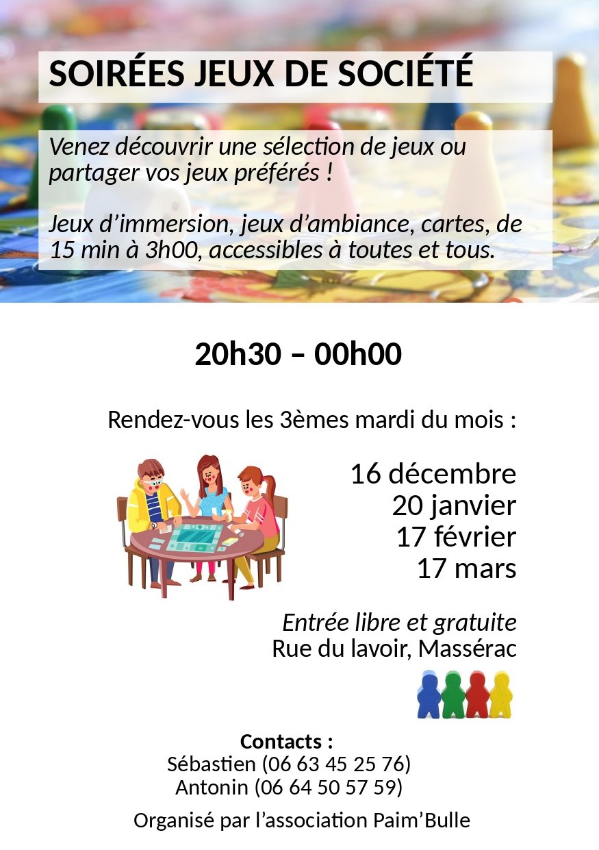 L'association Paim'Bulle organise une soirée jeux de sociétés à Massérac. 🎲😀