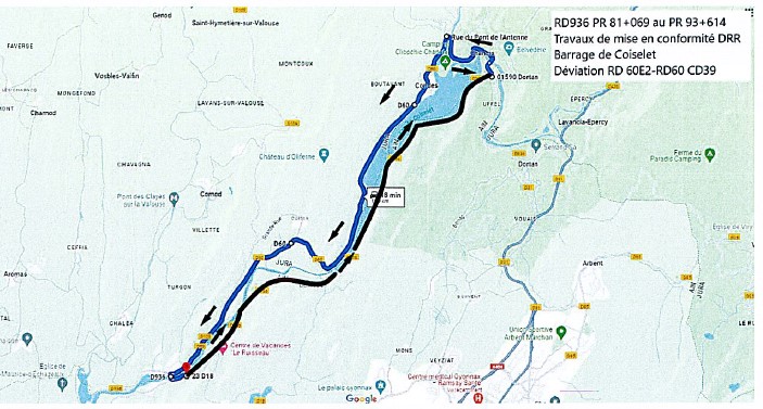 Une déviation sera mise en place pour tous les véhicules. Cette déviation empruntera les voies suivantes : RD 60, RD 60e2 (côté Jura) RD 936 et RD 31H (côté Ain).