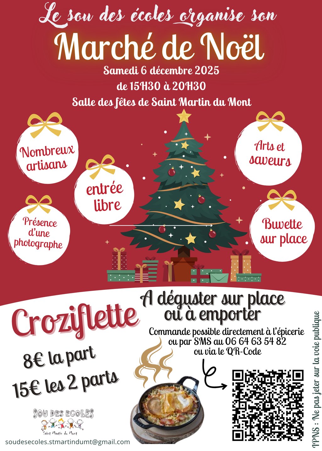 Le Sou des Écoles vous invite à son traditionnel Marché de Noël le samedi 6 décembre 2025, de 15h30 à 20h30, à la salle des fêtes de Saint Martin du Mont 🎅