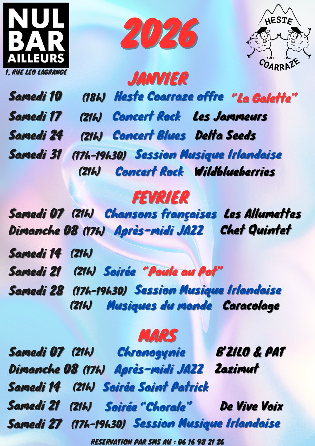 Voici le programme des animations au "Nul Bar Ailleurs" pour le 1ᵉʳ trimestre 2026.
