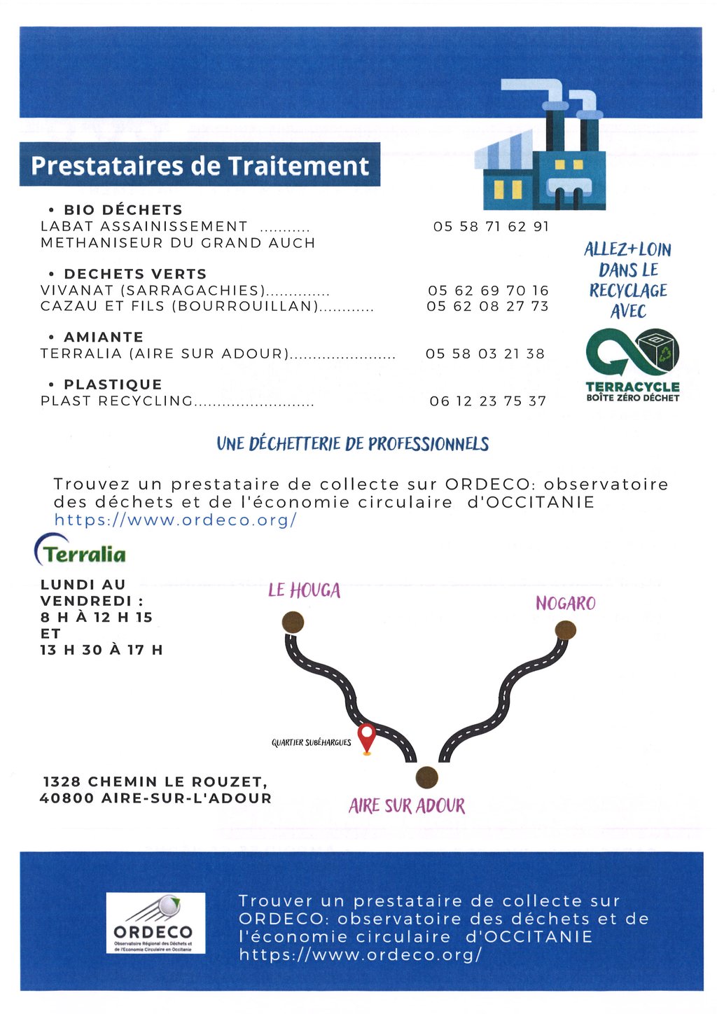 Nous vous rappelons que la déchetterie de professionnels TERRALIA à AIRE SUR L'ADOUR peut accueillir certains de ces déchets.