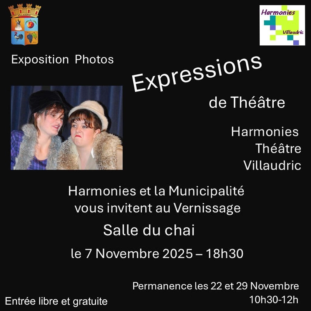 Vendredi 7 novembre à 18h30, HARMONIES THÉÂTRE et la MUNICIPALITÉ vous invitent à découvrir " EXPRESSIONS DE THÉÂTRE", une expo photo qui révèle la puissance expressive des comédiens sur scène.