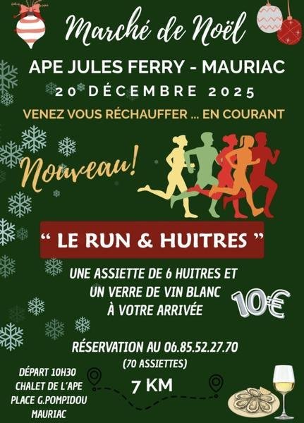 Nouveauté ! Venez vous réchauffer...en courant (7km) ! A l'arrivée 1 assiette de 6 huîtres + 1 verre de vin blanc, sur réservation au 06 85 52 27 70 (70 assiettes) départ depuis le chalet place Georges Pompidou au profit de l'APEM Jules Ferry.