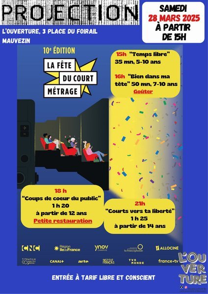 Dans le cadre de la fête du court métrage, l'Ouverture vous propose une belle sélection, pour petits et grands, samedi 28 mars 2026 à partir de 15h.
