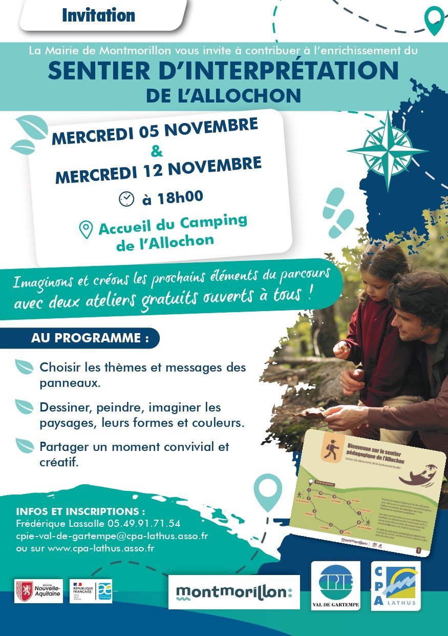 Mercredis 5 et 12 novembre 2025, la ville de Montmorillon, en partenariat avec le CPIE Val de Gartempe vous proposent de participer à deux ateliers participatifs autour du sentier d'interprétation de l'Allochon inauguré samedi 18 octobre. L'objectif de ces ateliers ? Choisir les thèmes et les messages des prochains panneaux, dessiner, peindre et imaginer les paysages, leurs formes et leurs couleurs, partager un moment convivial et créatif et enrichir les panneaux proposés aux randonneurs qui souhaiteraient découvrir la biodiversité communale de notre territoire.