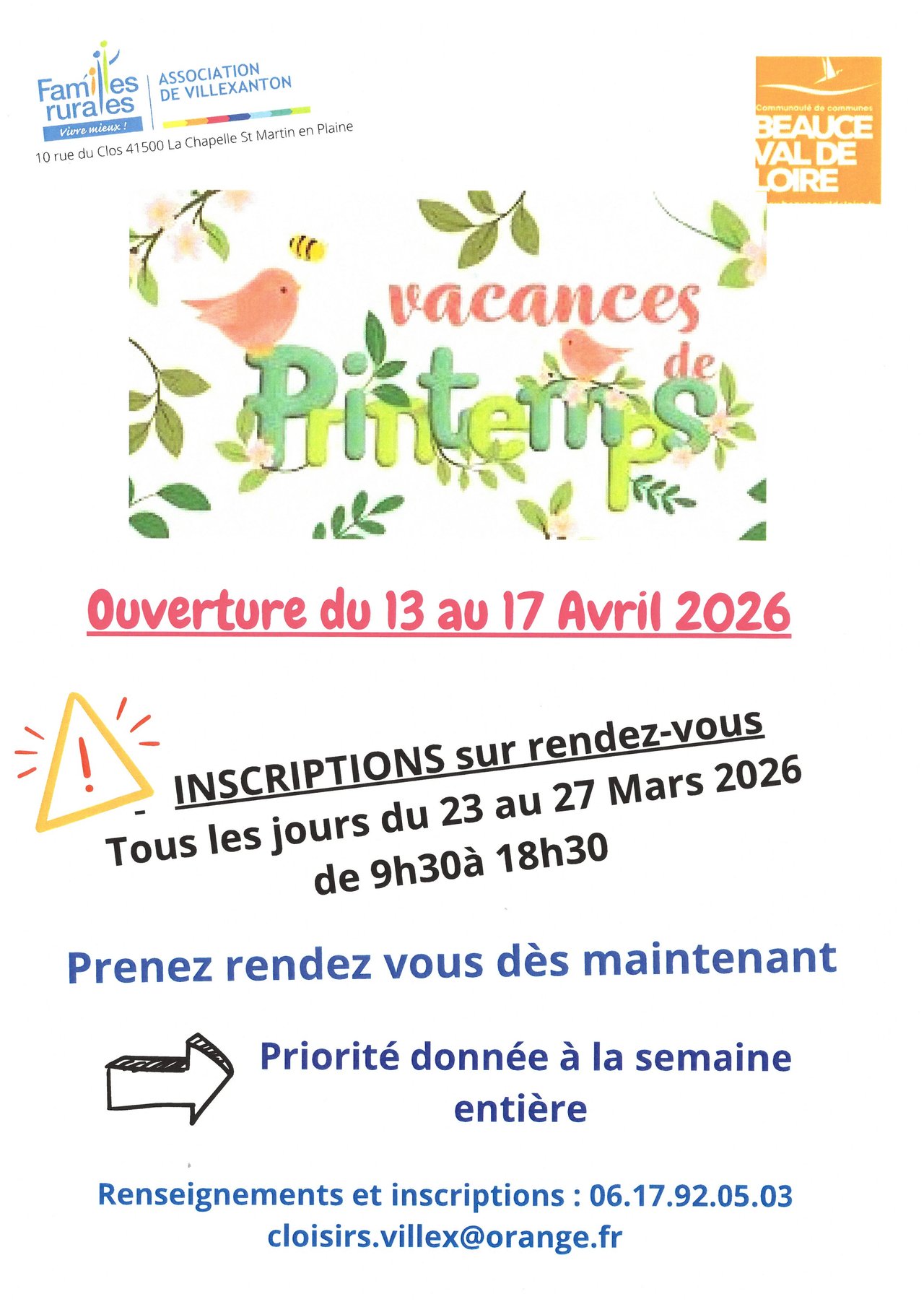 Ouverture du centre de loisirs du 13 au 17 avril 2026