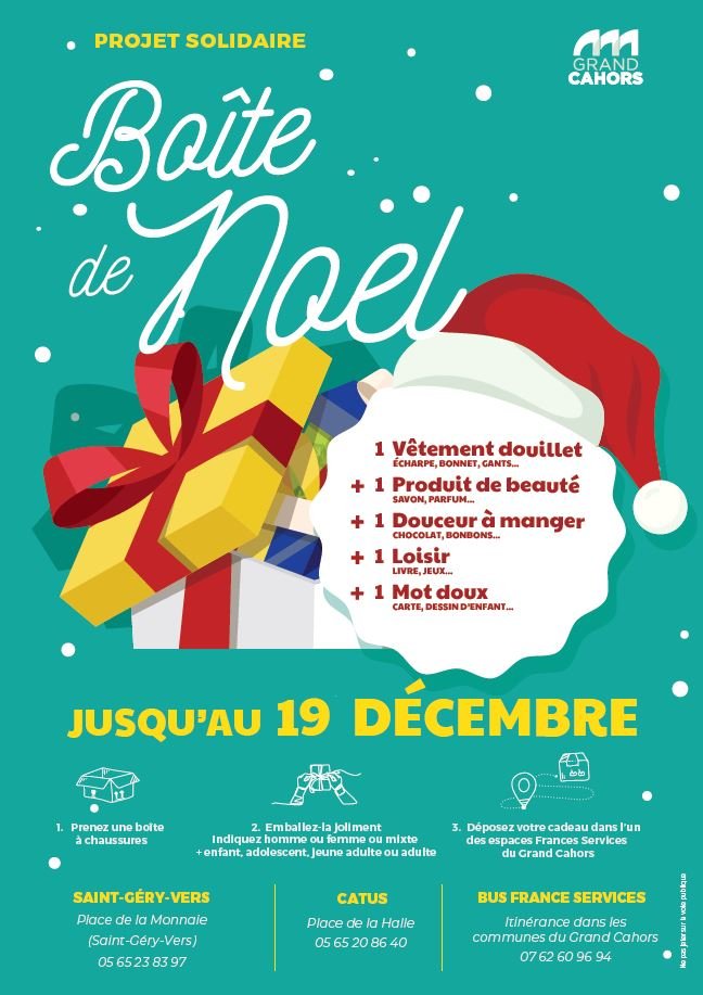 Les colis peuvent être déposés dans les France services du Grand Cahors (SAINT-GERY / CATUS / BUS FRANCE SERVICES) avant d'être dispatchés en fonction des besoins identifiés notamment par les mairies. De ce fait, merci de nous faire parvenir la tranche d'âge ainsi que le sexe de la personne concernée afin de faire correspondre au mieux le contenu de la boite.