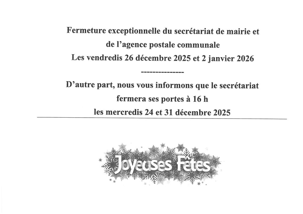 Ci-joint une information concernant les fermetures exceptionnelles du secrétariat de mairie et de l'Agence Postale Communale pendant les vacances de Noël.