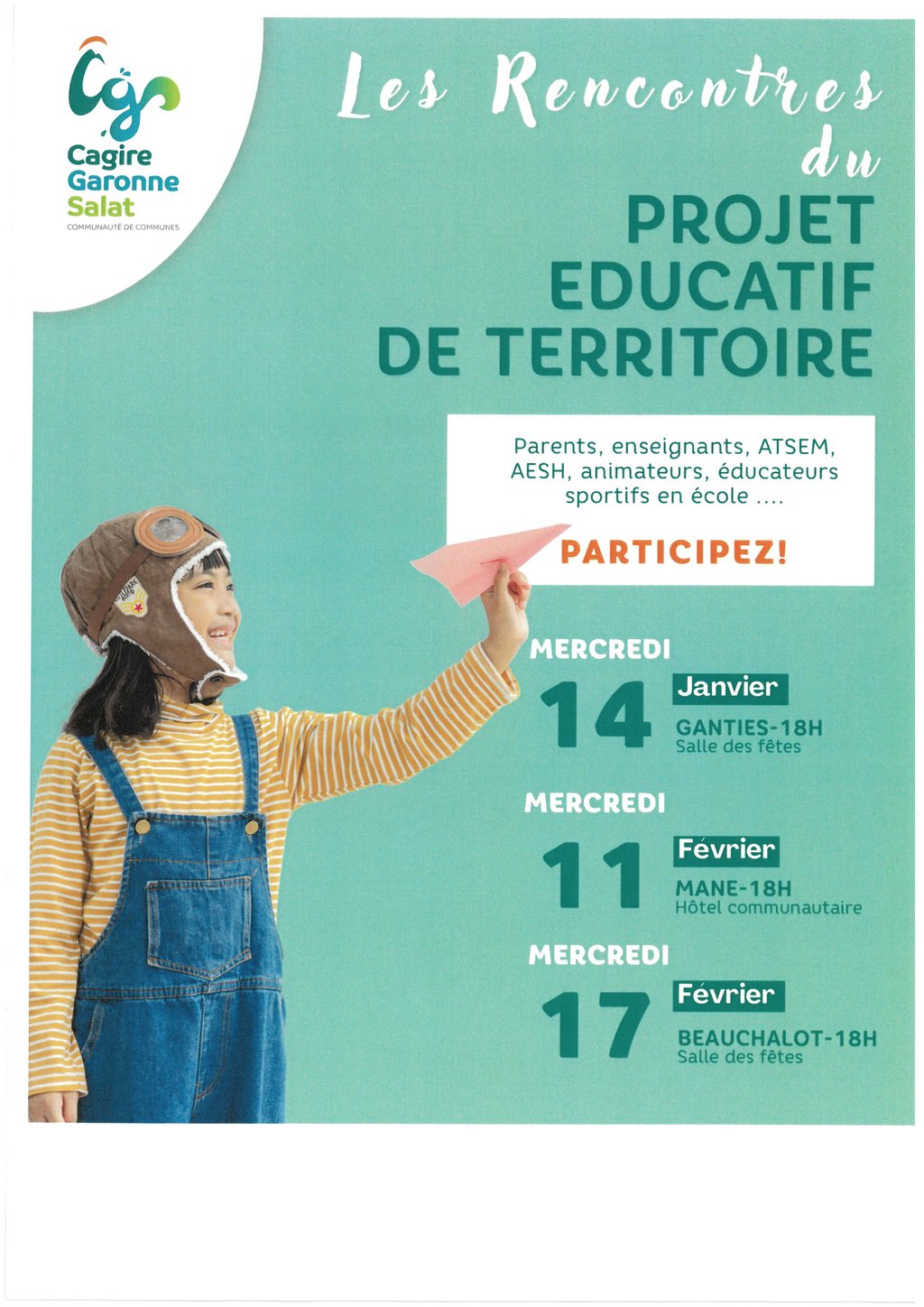 Ci-joint l'invitation aux rencontres territoriales organisées dans le cadre du Projet Educatif du Territoire de la Communauté de Communes Cagire Garonne Salat.
