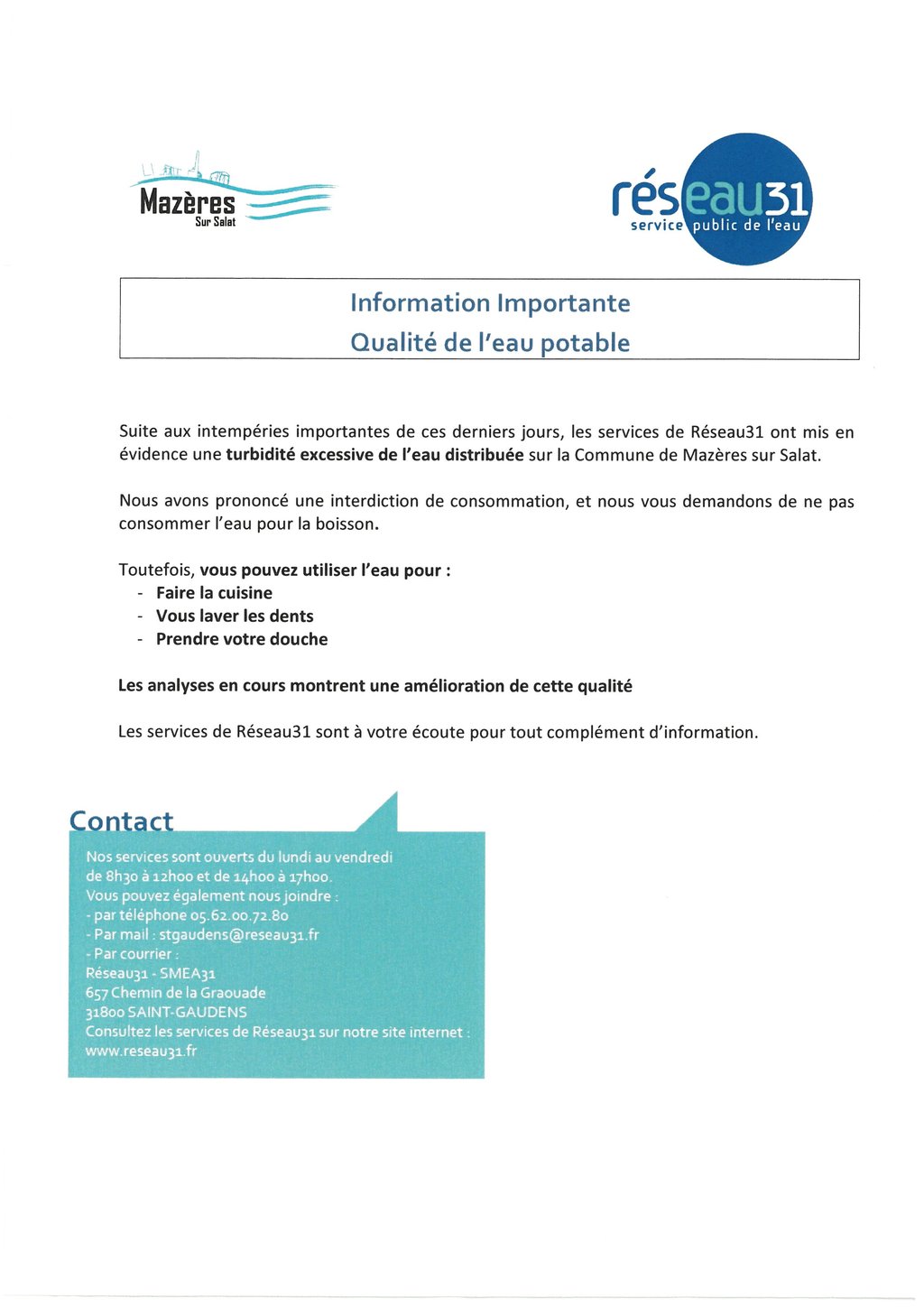 Ci-joint une information de Réseau 31 sur la qualité de l'eau potable.