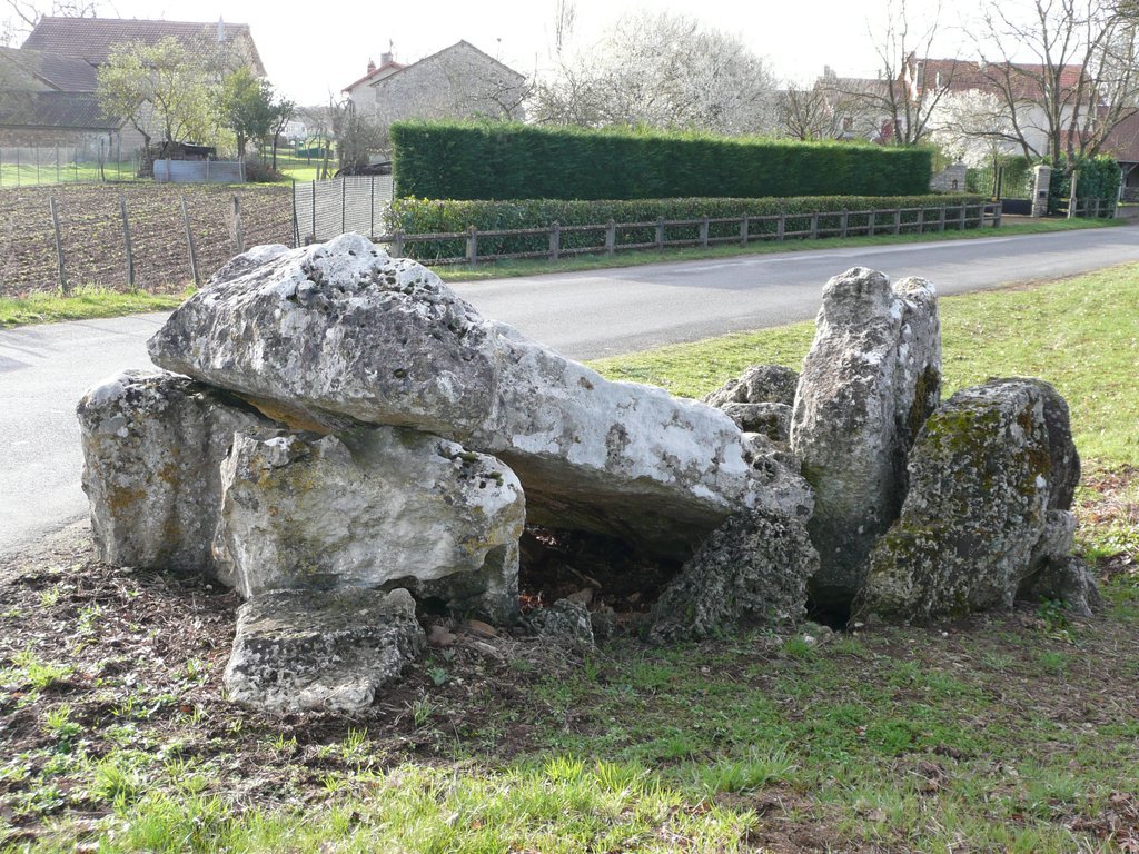 Utilisé comme étable à moutons à la fin du 19ème siècle, ce monument a été déplacé à plusieurs reprises lors des élargissements successifs de la route. Il est composé d’une dalle soutenue par cinq piliers en calcaire. Les fouilles réalisées ont révélé la présence d’ossements humains, des tessons de céramique grossière et un petit tranchet en silex.