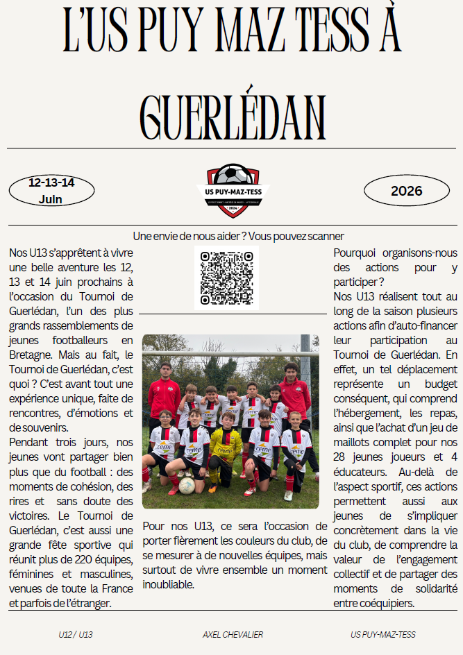 US PUY MAZ TESS - SOUTIEN AU CLUB POUR LE TOURNOI INTERNATIONAL DE GUERLÉDAN JUIN 2026