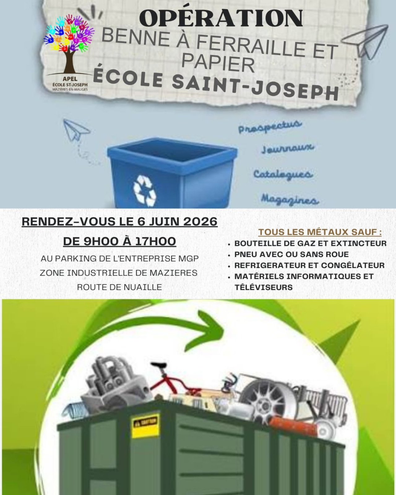 Cette année, l'APEL de l'école St Joseph fait une benne à papier et à ferraille !
