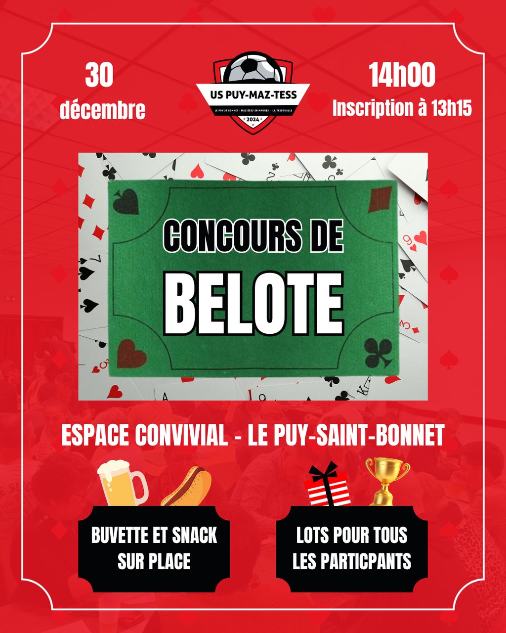 Le club US PUY-MAZ-TESS a le plaisir de vous inviter à son tournoi annuel de belote, qui se déroulera le mardi 30 décembre à l’Espace Convivial du Puy-Saint-Bonnet.