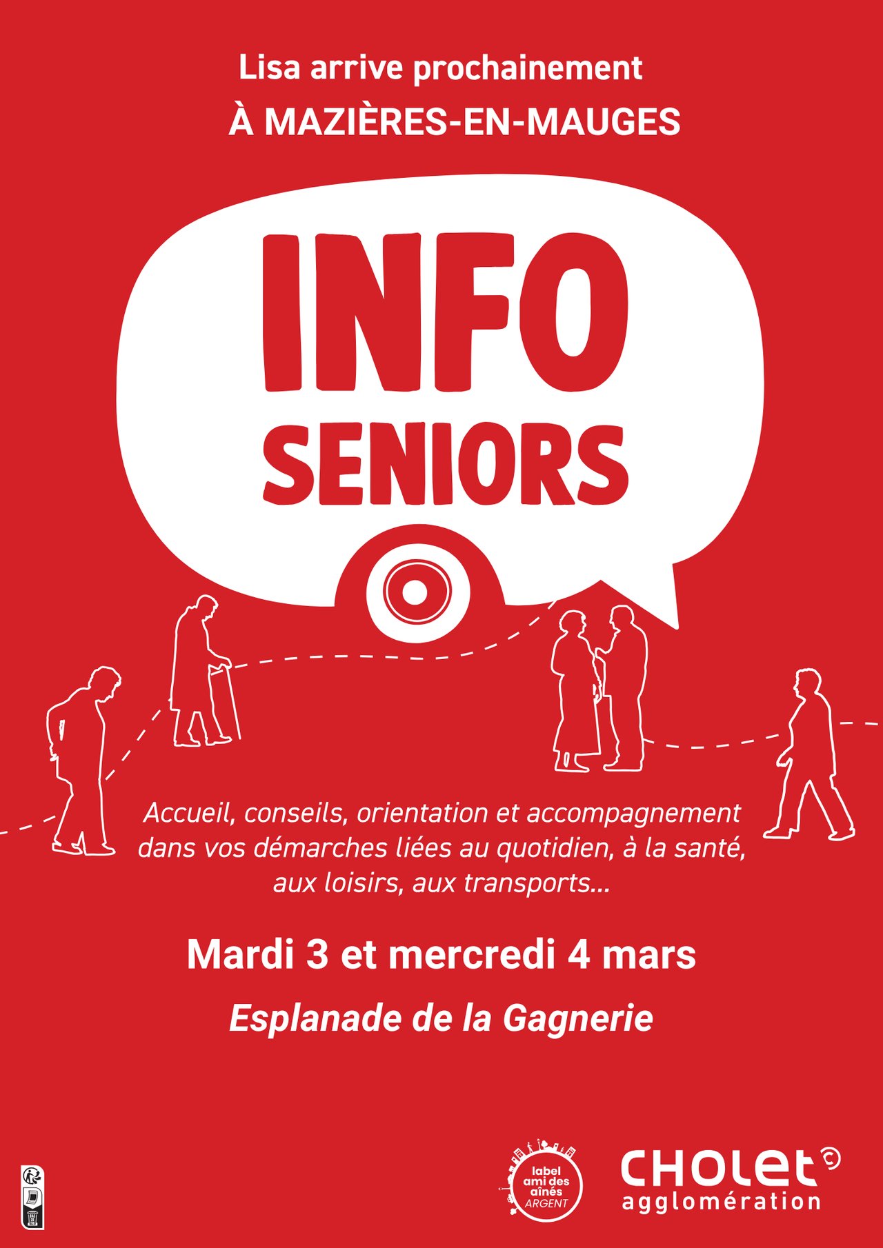 Vous avez des questionnements sur les services proposés par Cholet Agglomération, sur le CLIC IGEAC..., la caravane LISA sera présente sur l'esplanade de la Gagnerie les mardi 03 et mercredi 04 mars 2026 de 9h30 à 12h et de 14h à 16h. N'hésitez pas à venir à sa rencontre !