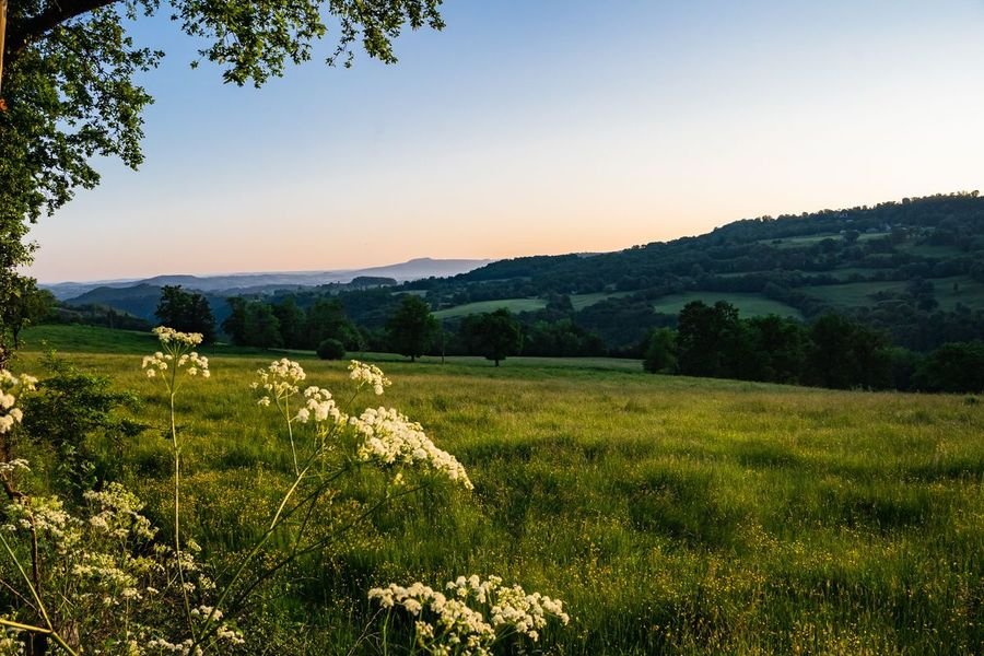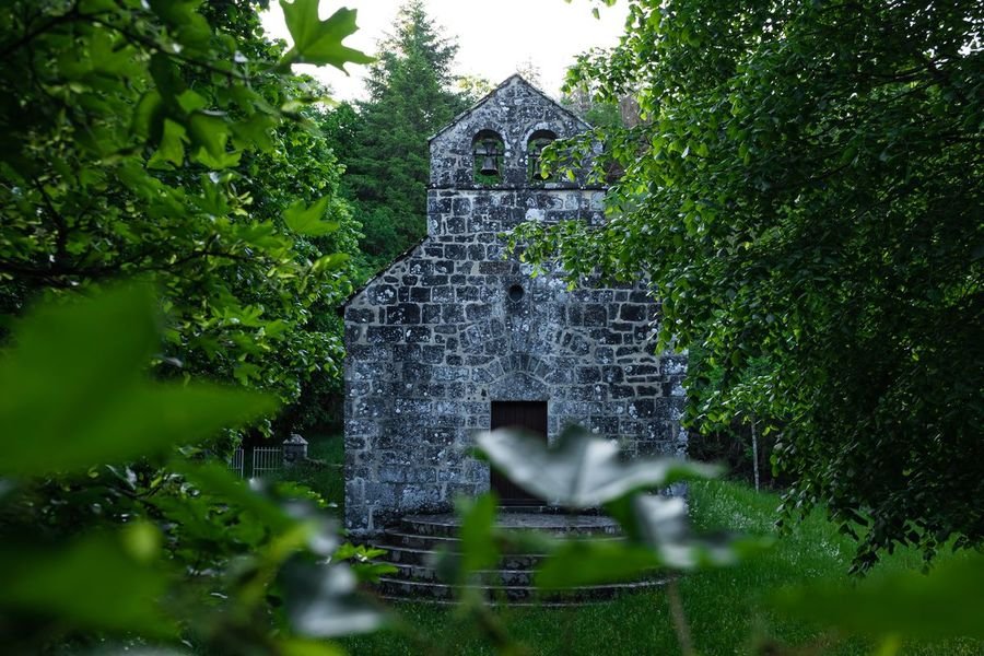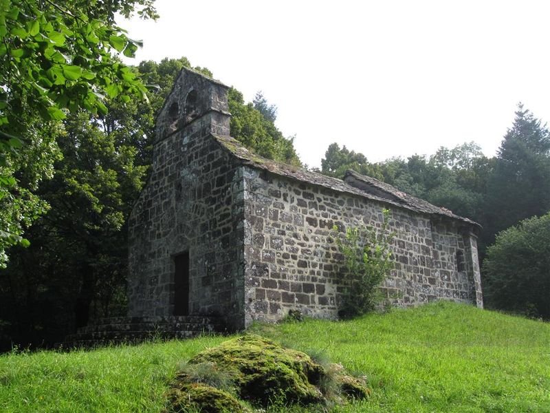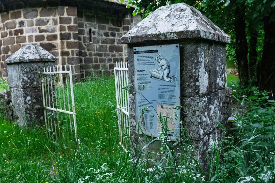 Le chemin bordé de murs en pierres sèches conduit le visiteur vers une destination qui semble hors du temps. Petit à petit derrière une végétation luxuriante, en contre-bas, se devine le gris de la pierre volcanique, la chapelle se dévoile lentement. Avec comme toile de fond les monts du Cantal, le site est installé sur un éperon rocheux qui domine la vallée du Mars. L’étonnement est là quand on découvre au milieu de nulle part une chapelle romane et un chemin de croix doté de quatorze blocs de pierre sculptés par un ermite connu, au 19ème siècle.