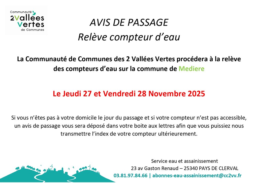 La relève des compteurs d’eau aura lieu du jeudi 27 au vendredi 28 novembre 2025 dans la commune de Médière.