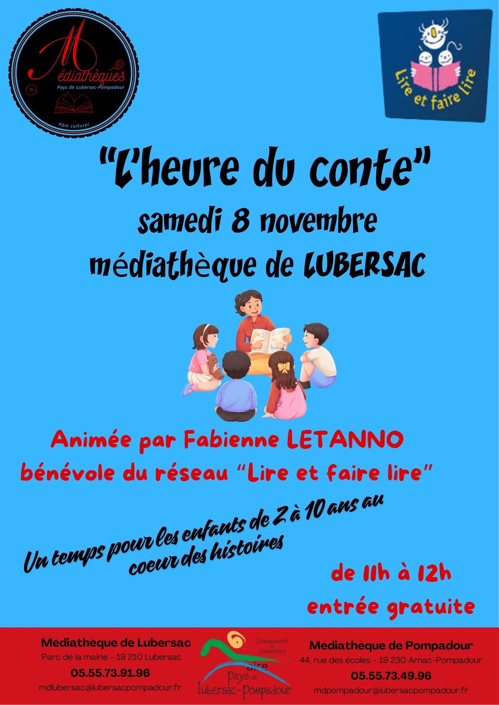 Les médiathèques du Pays de Lubersac-Pompadour vous proposent "l'heure du conte" pour les enfants de 2 à 10 ans samedi 8 novembre de 11h à 12h à la médiathèque de Lubersac.