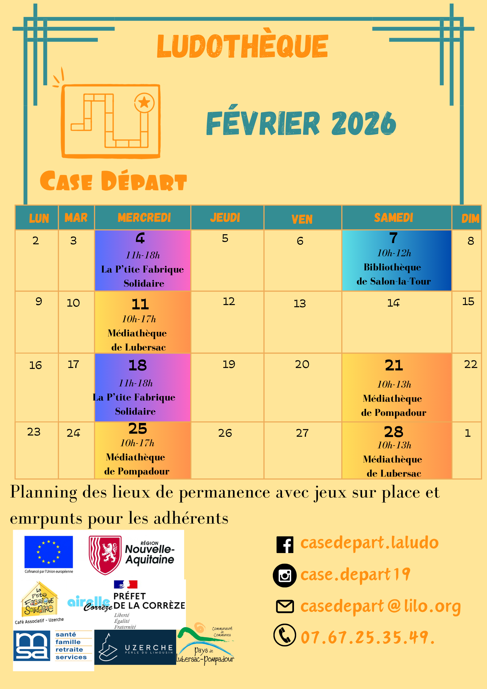 La ludothèque Case Départ vous accueille sur différents lieux, tout au long du mois et de l'année. Vous pouvez venir jouer sur place et emprunter des jeux.