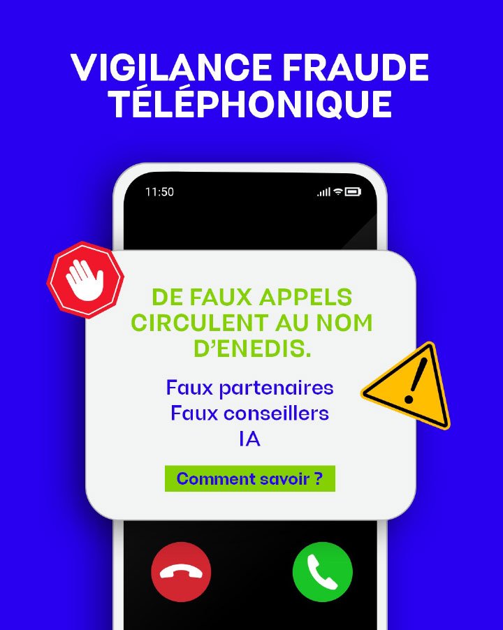 ENEDIS constate une recrudescence de personnes malveillantes se faisant passer pour Enedis ou ses partenaires pour obtenir des informations personnelles. En tant que service public, Enedis ne pratique aucun démarchage commercial et ne vend aucun produit ou service.