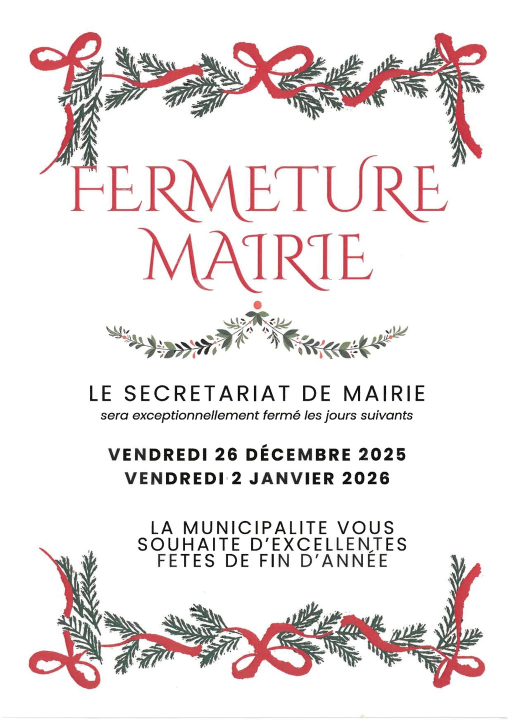En raison des fêtes de fin d'année, les bureaux de la mairie seront fermés les :