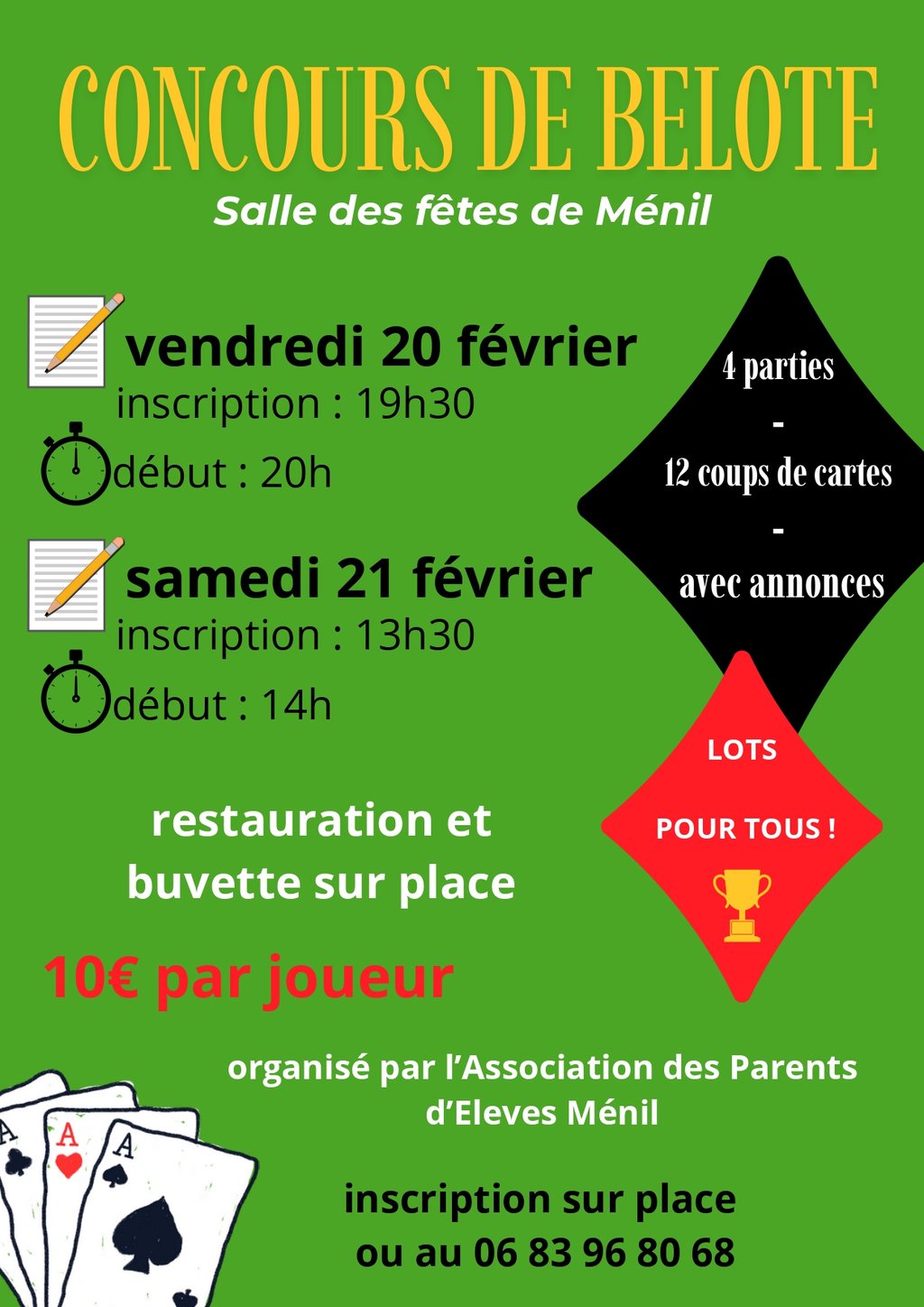L' Association de Parents d'Elèves de Ménil organise un concours de belote les 20 et 21 février.
