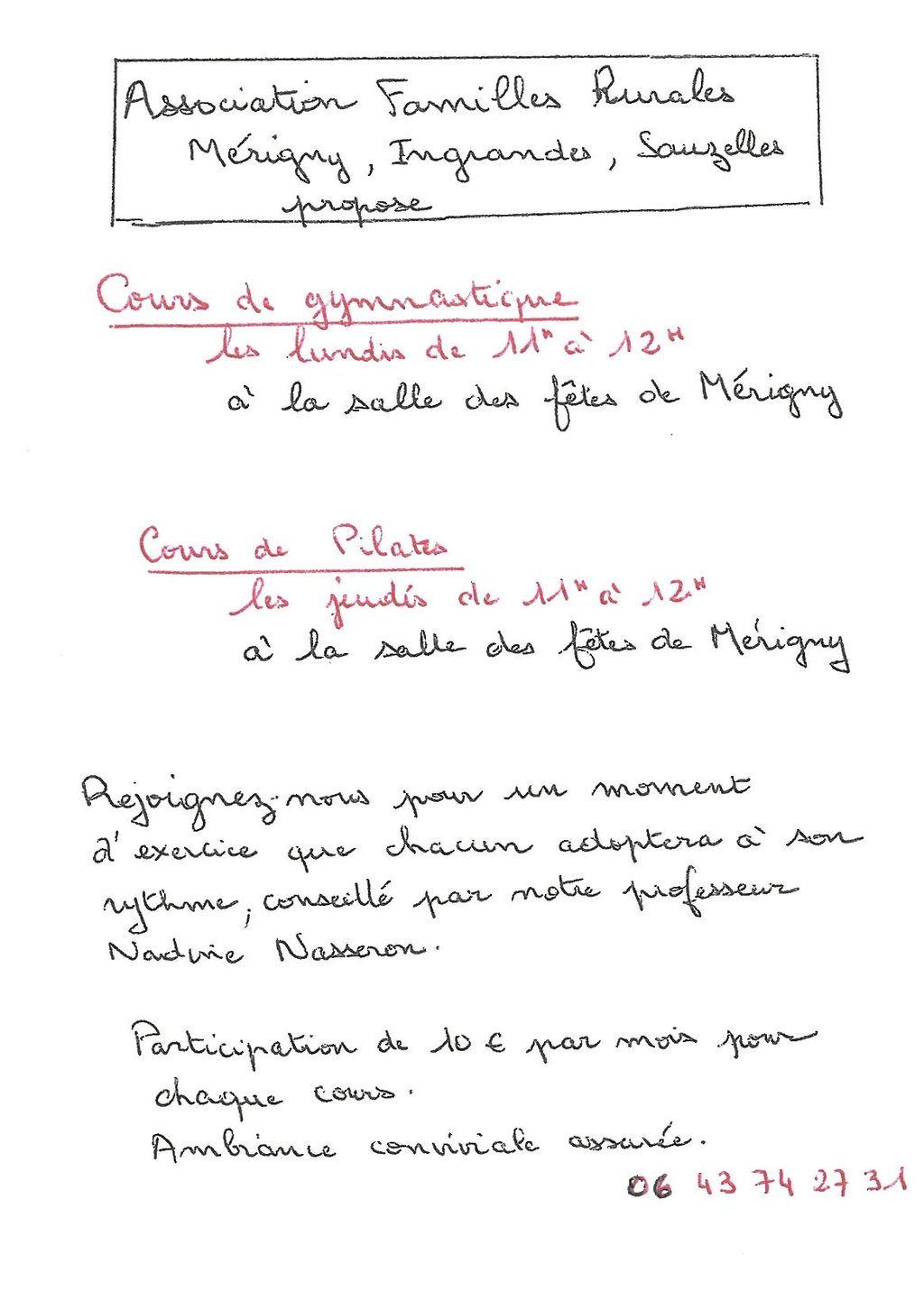 Nous vous informons que la reprise des cours de gymnastique et de Pilates est fixée au 1er Septembre 2025.