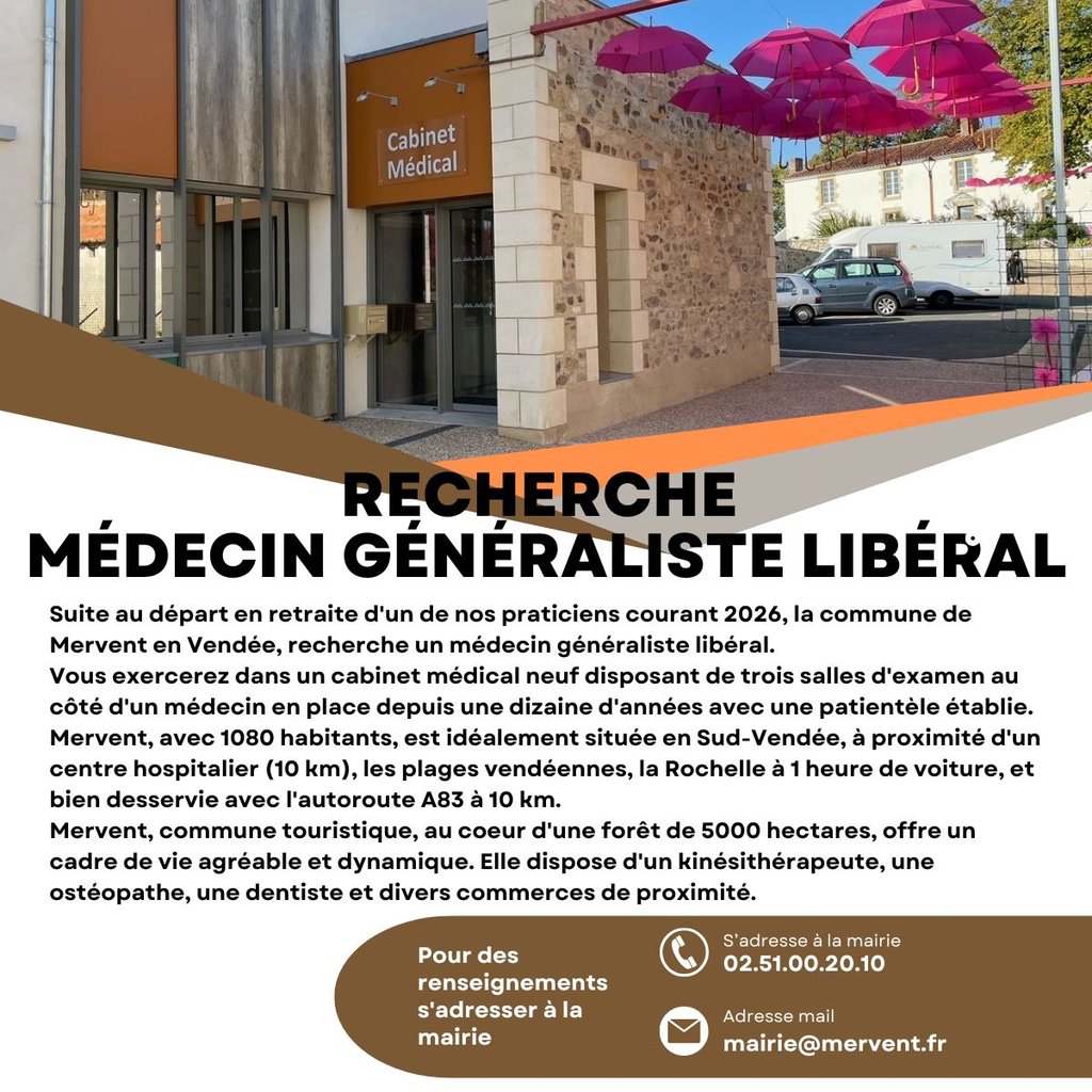 Suite au départ en retraite d'un de nos praticiens courant 2026, la commune de Mervent en Vendée, recherche un médecin généraliste libéral.