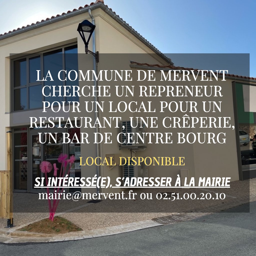 Si vous souhaitez candidater, demandez le dossier de présentation du projet de reprise du restaurant auprès de la mairie par mail à mairie@mervent.fr ou par téléphone au 02 51 00 20 10.