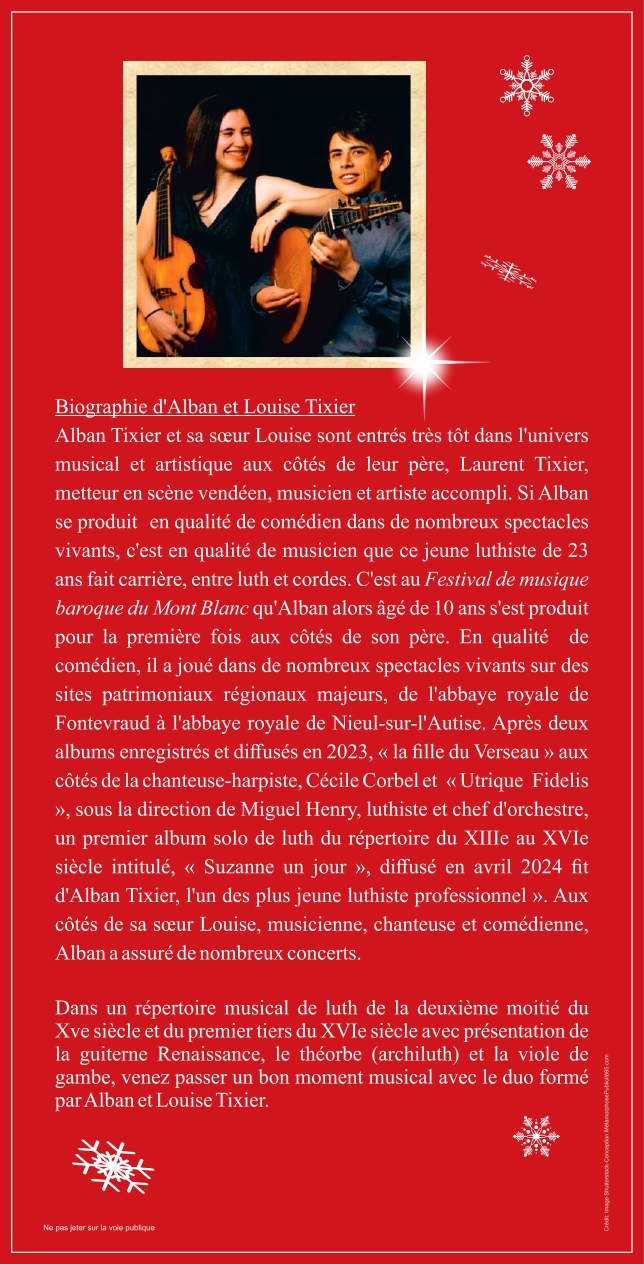 Dans un répertoire musical de luth de la deuxième moitié du XVè siècle et du premier tiers du XVIe siècle avec présentation de la guiterne Renaissance, le théorbe (archiluth) et la viole de gambe, venez passer un bon moment musical avec le duo formé par Alban et Louise Tixier.