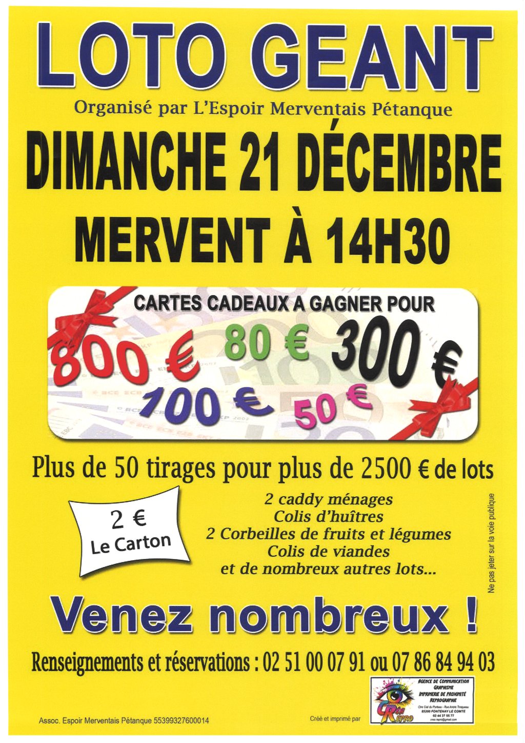 Loto géant organisé par l'Espoir Merventais Pétanque le dimanche 21 décembre à 14h30.