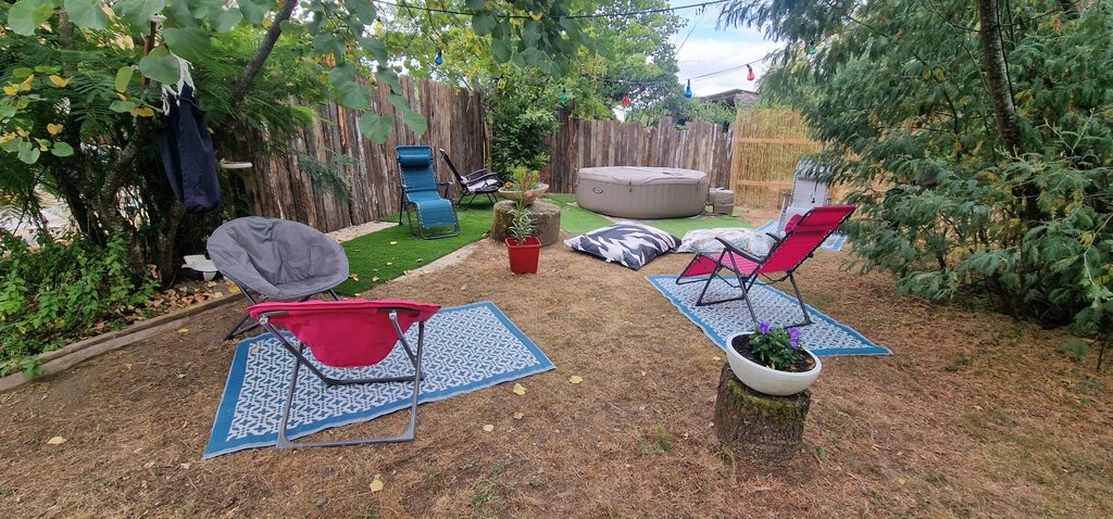 A l’extérieur, notre jardin, bien ombragé et fleuri, est idéal pour la détente. Profitez des chants des oiseaux pour vous relaxer dans notre spa ou sur les transats. Vous aurez aussi la joie de vous défier lors d'une partie de boules sur notre terrain de pétanque avant de déguster de bonnes grillades (barbecue à gaz et salon de jardin à disposition).