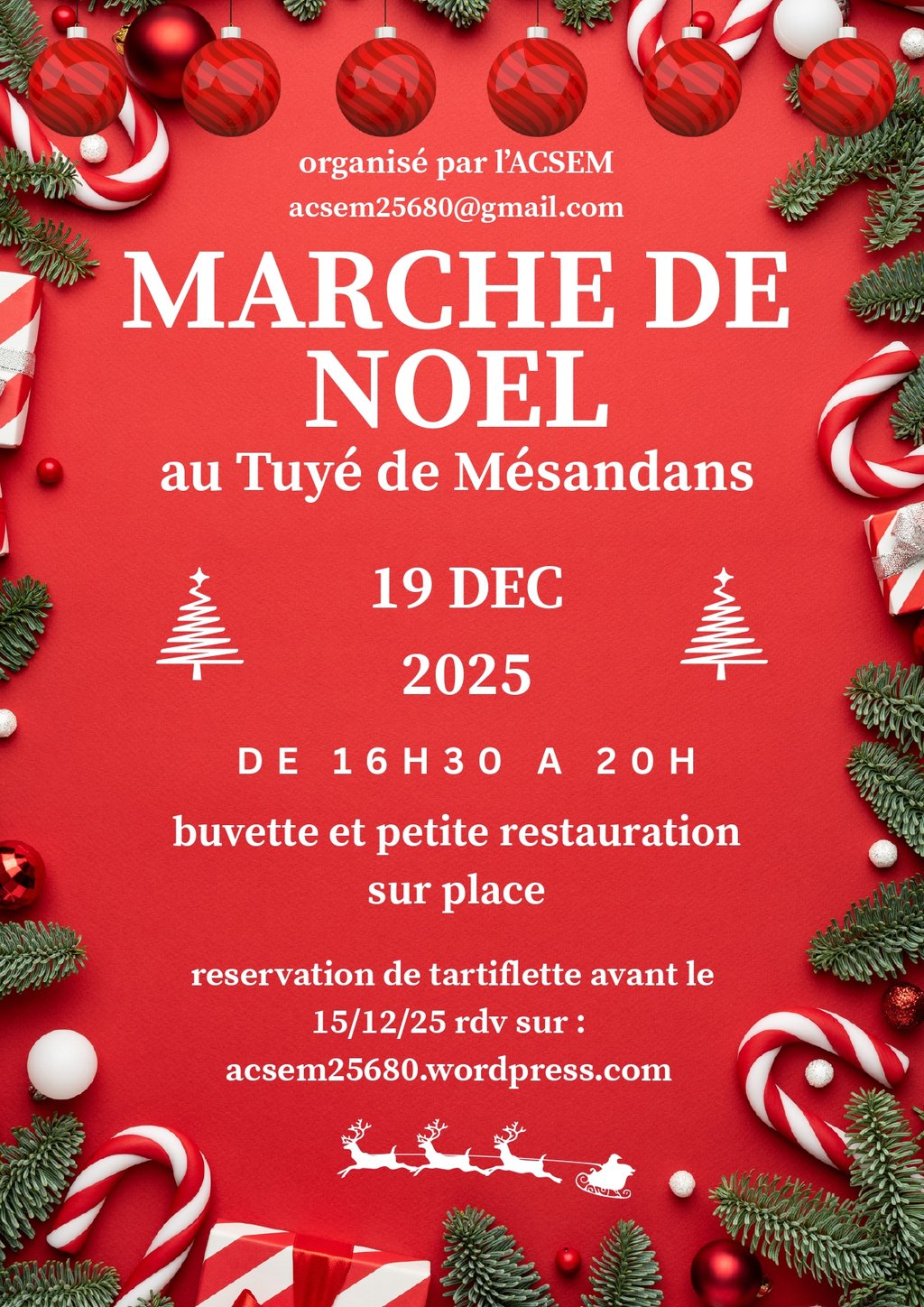Le vendredi 19 décembre 2025, de 16h30 à 20h, l’ACSEM organise son Marché de Noël au Tuyé de Mésandans.