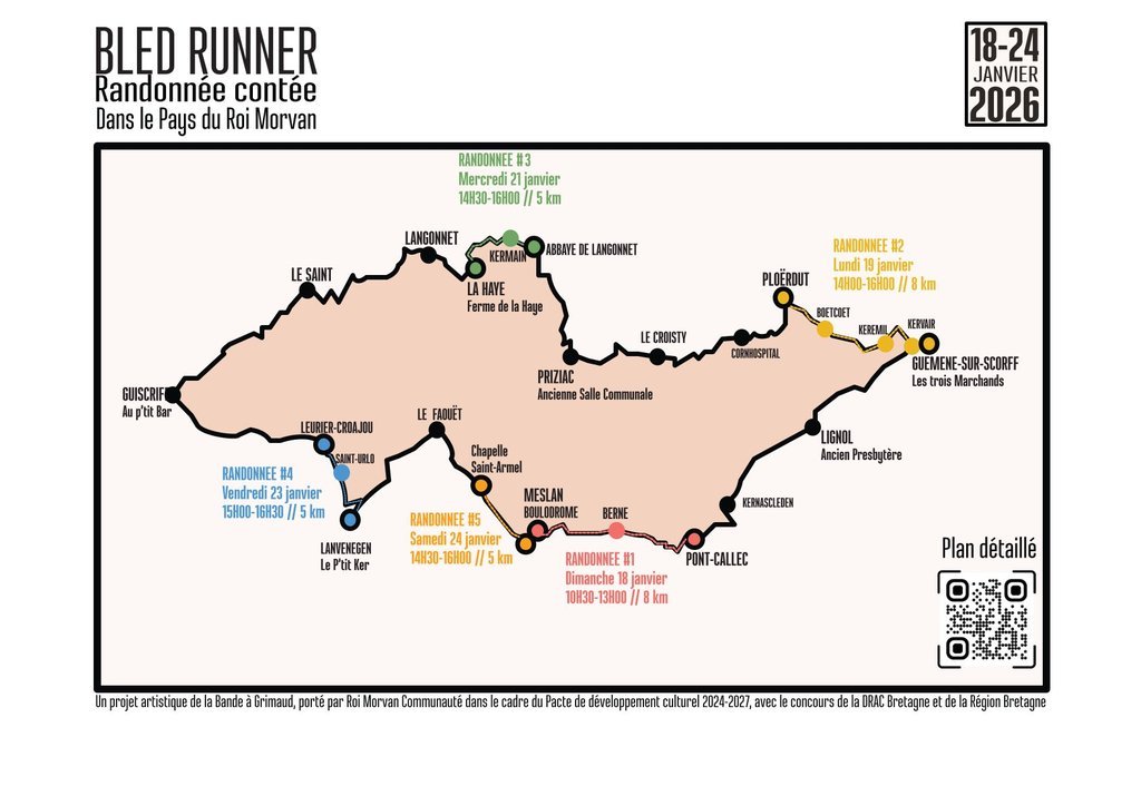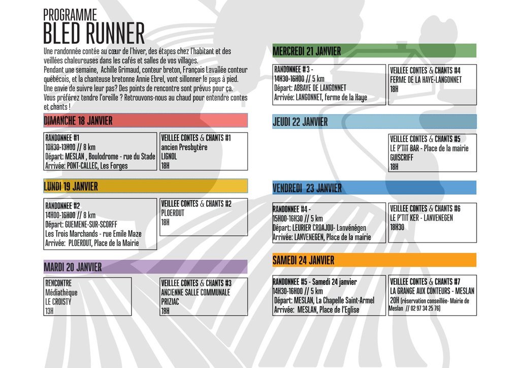 Pour lancer le grand projet de territoire « Légendes de l'Ouest », La Bande à Grimaud chausse les bottes avec Bled Runner. Pendant une semaine, un trio inédit, un conteur breton, Achille Grimaud, un conteur québécois, François Lavallée et une chanteuse bretonne, Annie Ebrel, va sillonner le pays à pied. Le concept ? Une randonnée contée au cœur de l'hiver, des étapes chez l'habitant et des veillées chaleureuses dans les cafés et salles de vos villages. Au programme : des histoires de « cousins » d'Amérique, des chants et la mémoire de ceux partis vers l'Ouest il y a un siècle qui résonne avec ceux d'aujourd'hui.