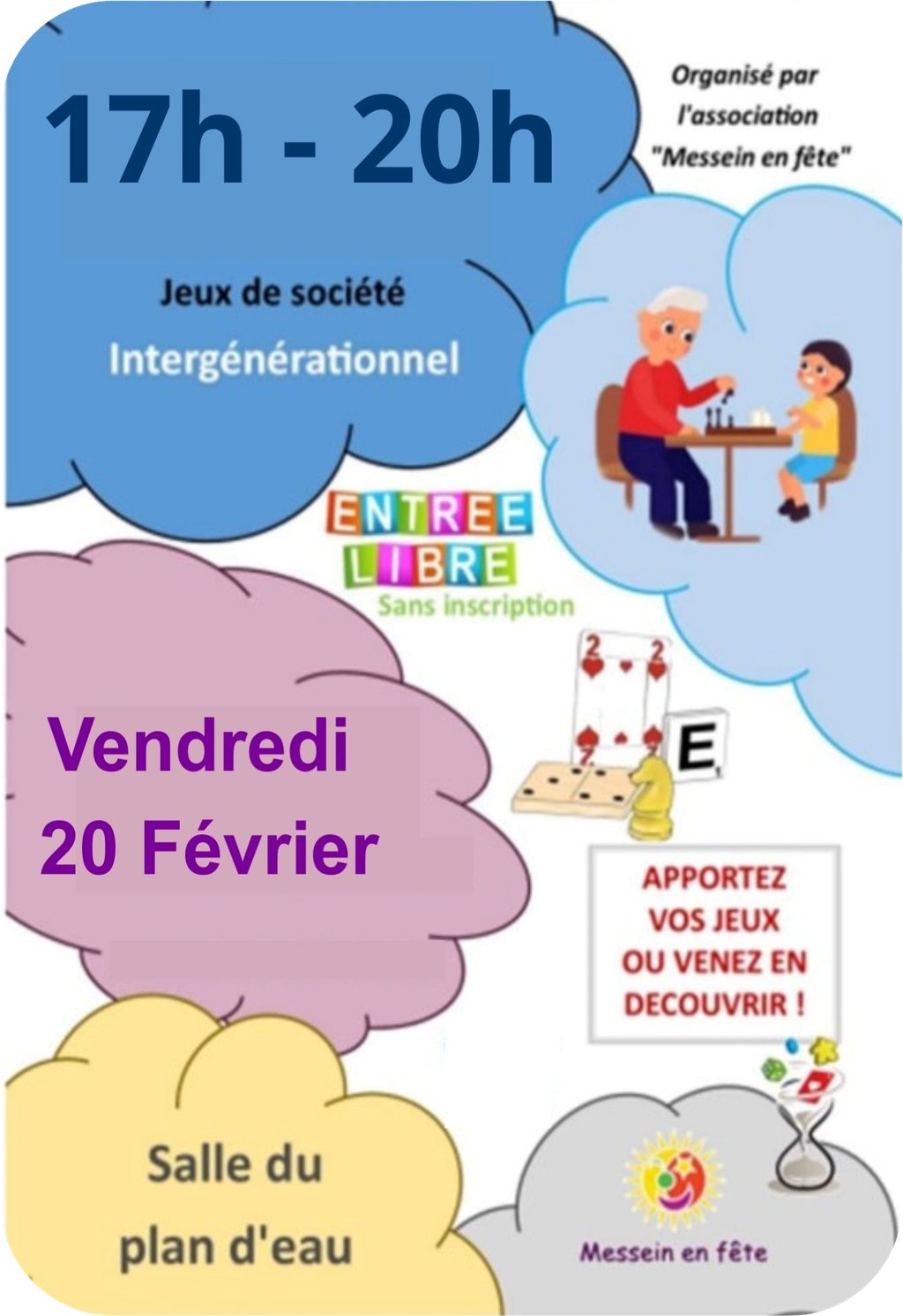 Jeux intergénérationnels,vendredi 20 février 2026, à partir de 18h00 à la salle du plan d'eau, organisé par l'association "Messein en fête"'.