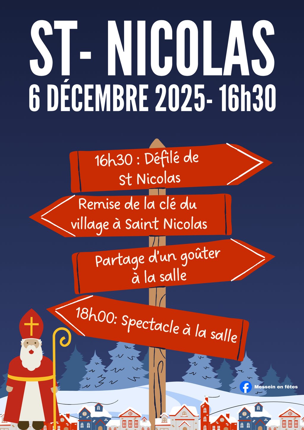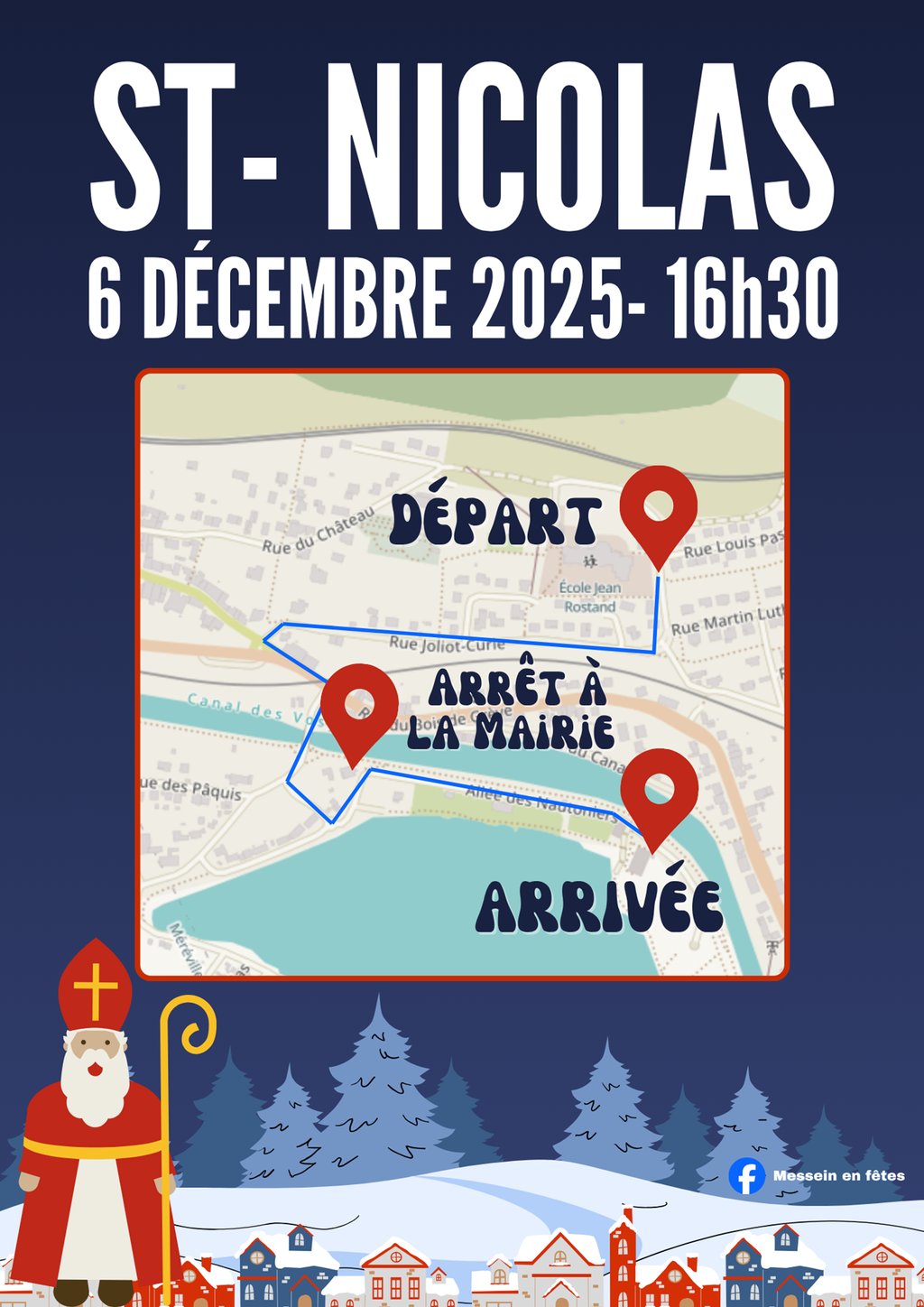 Samedi 6 décembre à 16h30, départ du défilé depuis l'école Jean Rostand, arrêt à la mairie pour la remise de la clé du village à St-Nicolas et arrivée à la salle Gilbert GARGAM pour le partage d'un goûter offert par l'association Messein en fête et distribution de confiseries aux enfants par la municipalité.