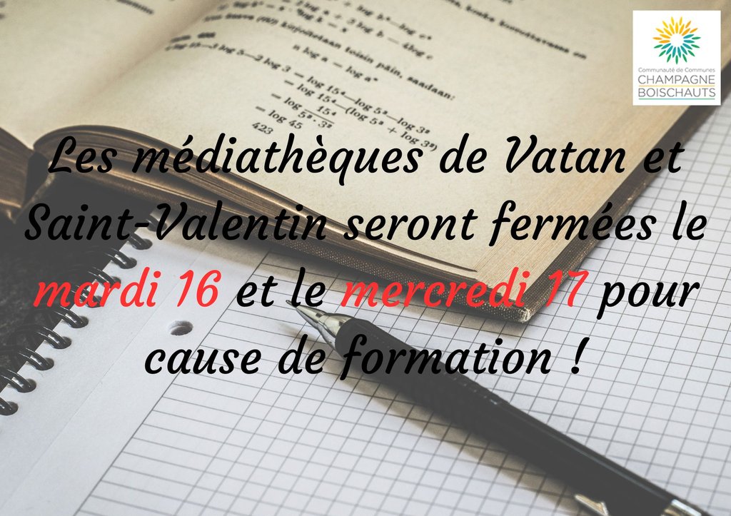 Les médiathèques de Vatan et Saint-Valentin seront exceptionnellement fermées le mardi 16 et le mercredi 17 décembre pour cause de formation ! 👩💻