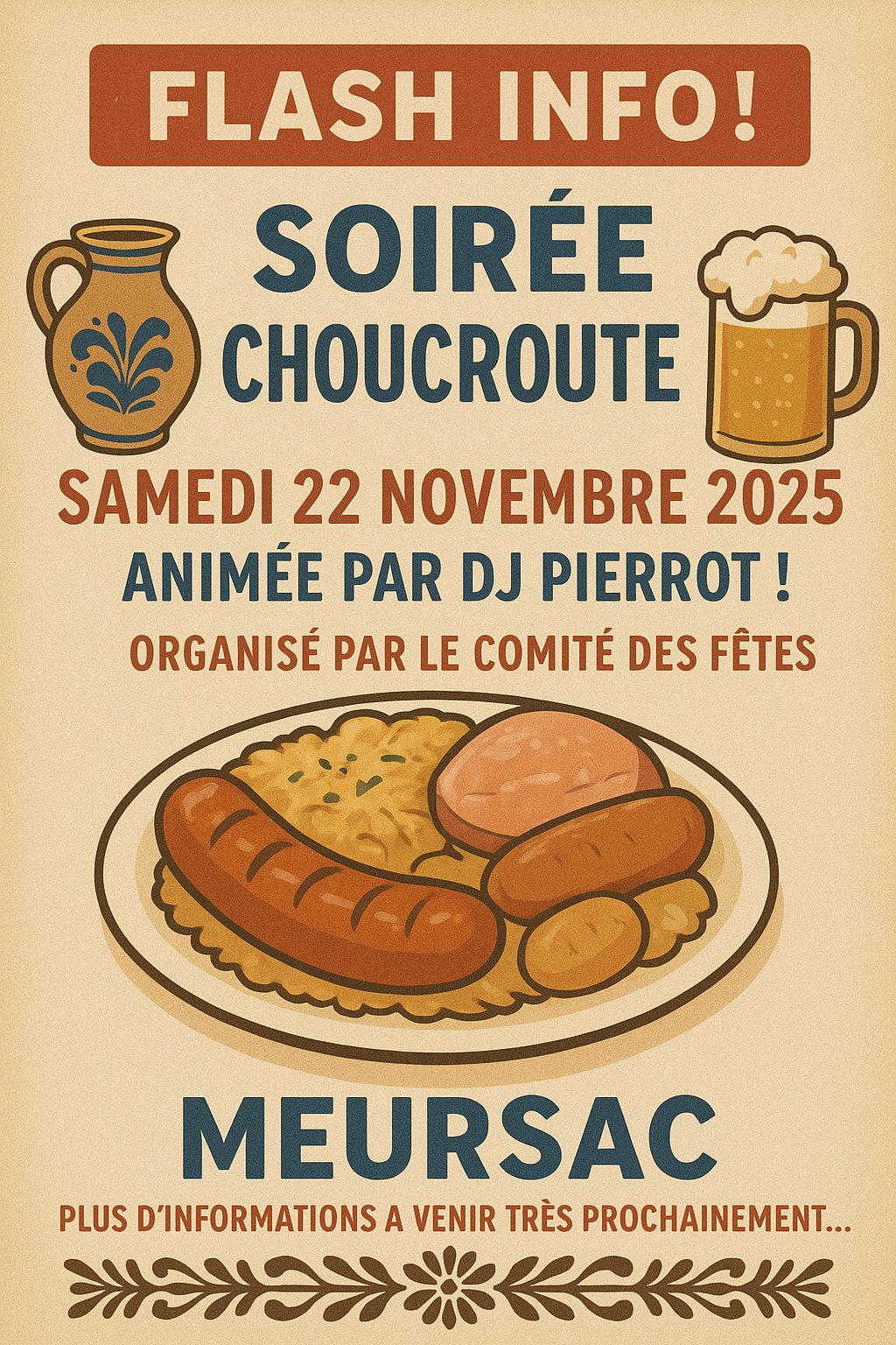 Le Comité des Fêtes de Meursac vous invite à partager un moment de convivialité et de bonne humeur le samedi 22 novembre, à partir de 19h30, à la salle des fêtes de Meursac 🎉