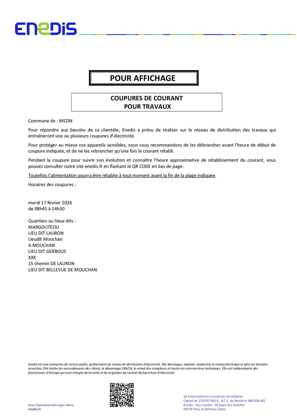 Horaires des coupures :mardi 17 février 2026 de 08 h 45 à 14 h 30