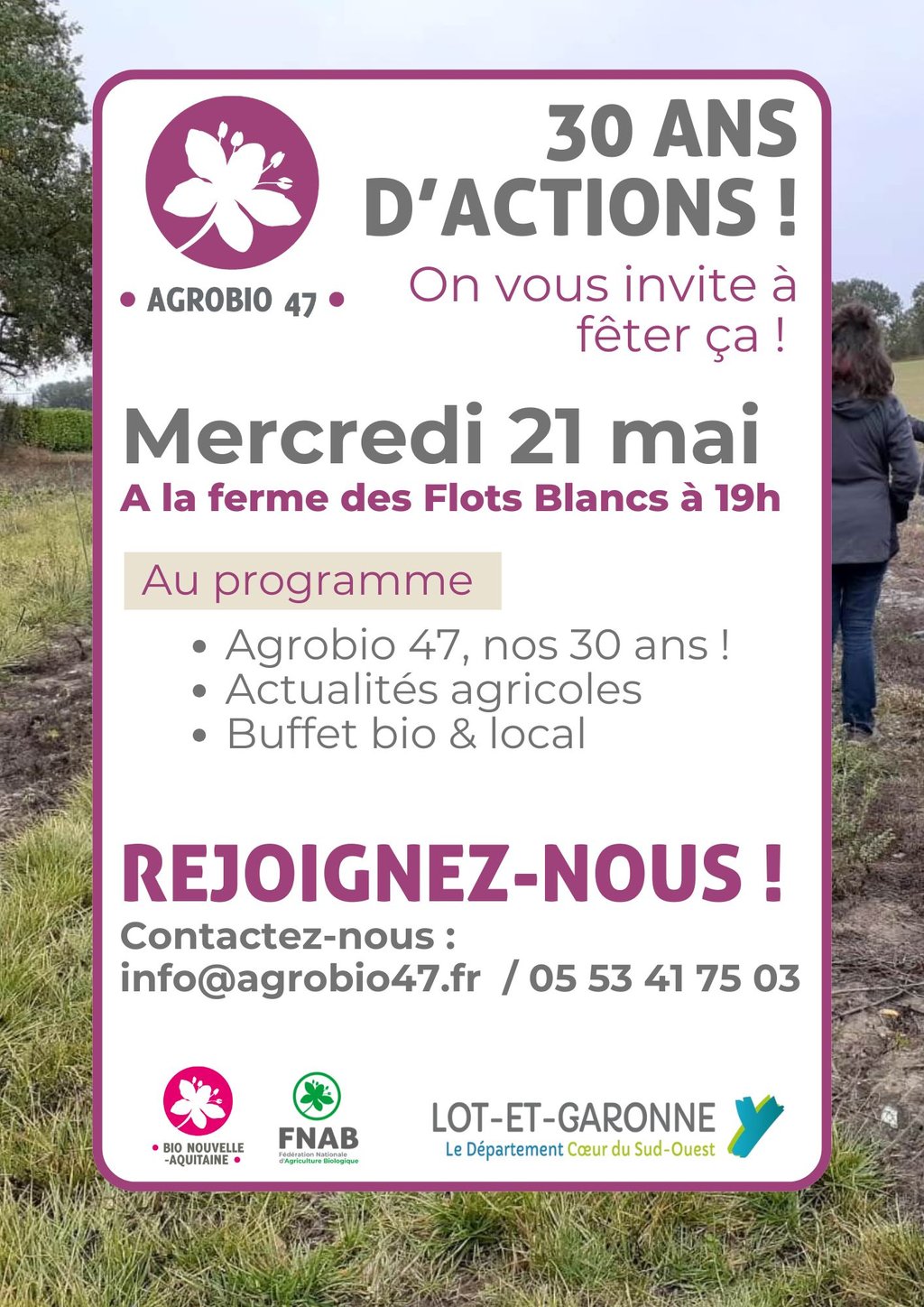 A cette occasion, notre Conseil d'Administration souhaite rassembler les agriculteurs en offrant une soirée conviviale, autour de discussions et des actions d'Agrobio47 sur notre département.