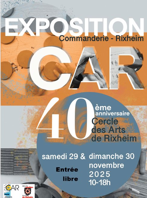 Les membres du Cercle des Arts de Rixheim ont le plaisir de vous inviter à fêter leur 40ème anniversaire samedi 29 et dimanche 30 novembre, de 10h à 18h, dans les salons de la Commanderie (Hôtel de Ville).