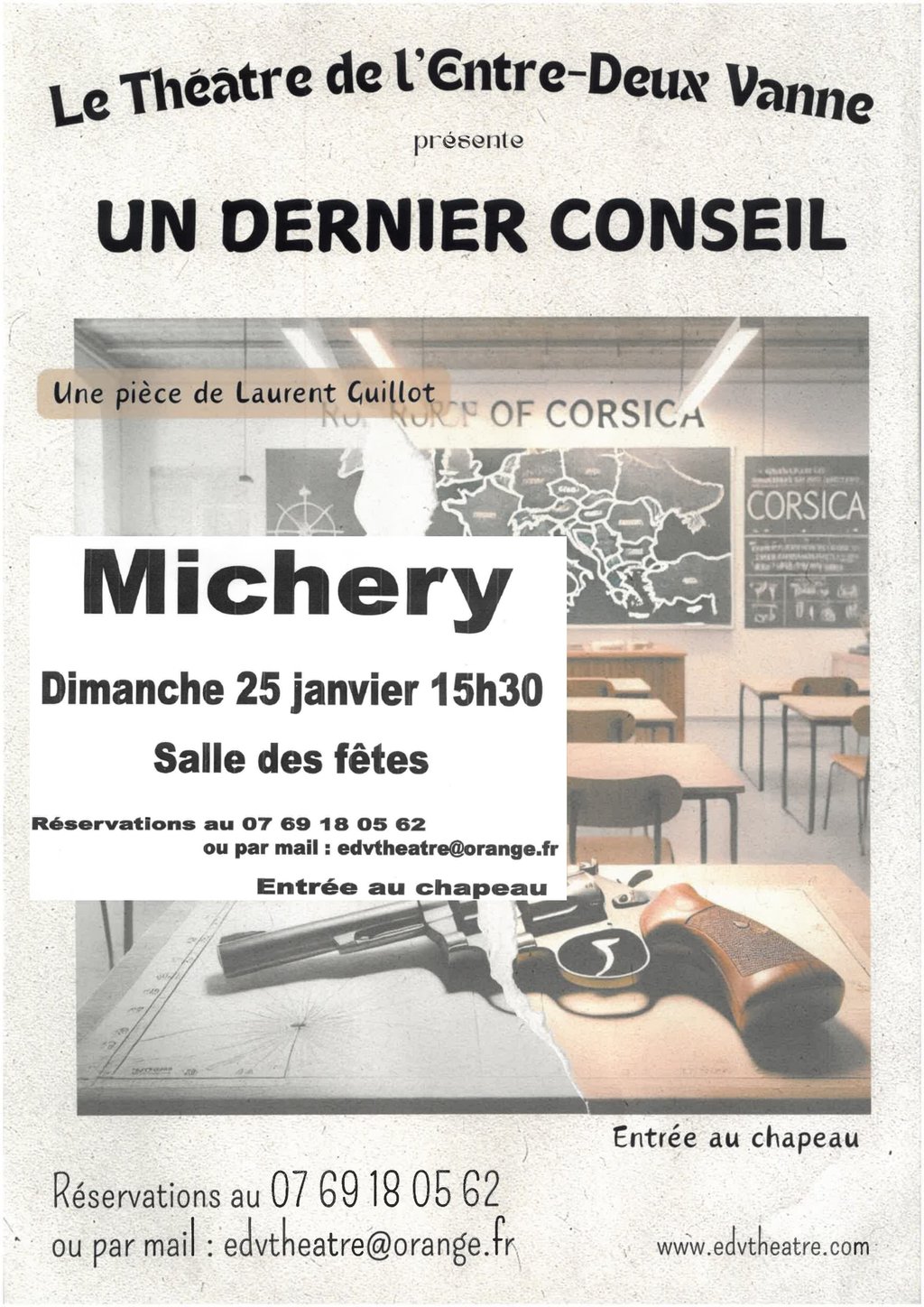 Représentation théâtrale le 25 janvier 2026 à la salle des fêtes de Michery à15h30.
