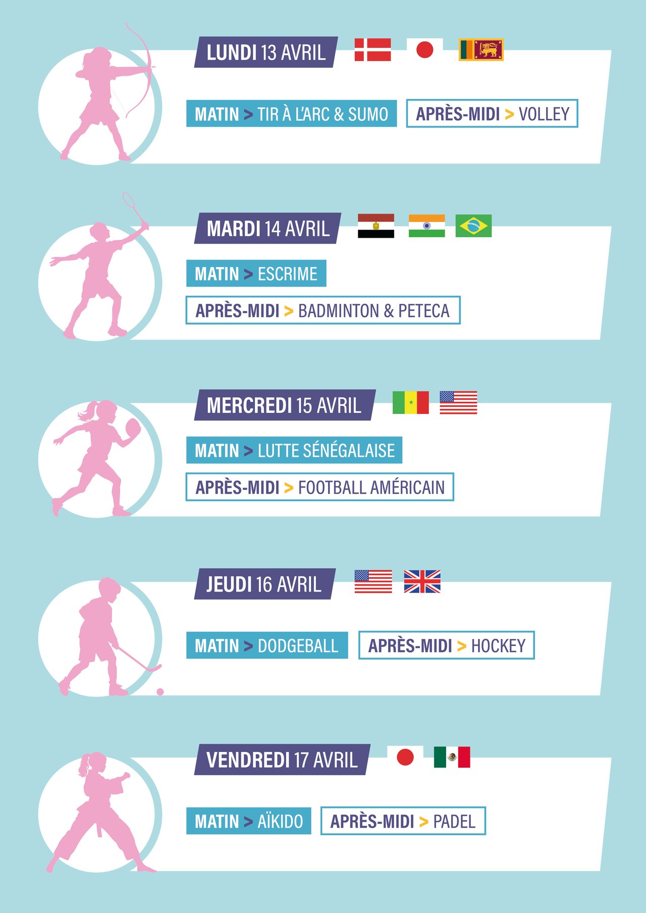 Du lundi 13 au vendredi 17 avril, ils partiront à la découverte de sports venus d’ici et d’ailleurs : tir à l’arc, sumo, volley, badminton, pétéca, football américain, dodgeball, hockey ou encore aïkido… de quoi bouger, tester, s’amuser et peut-être découvrir de nouvelles passions !