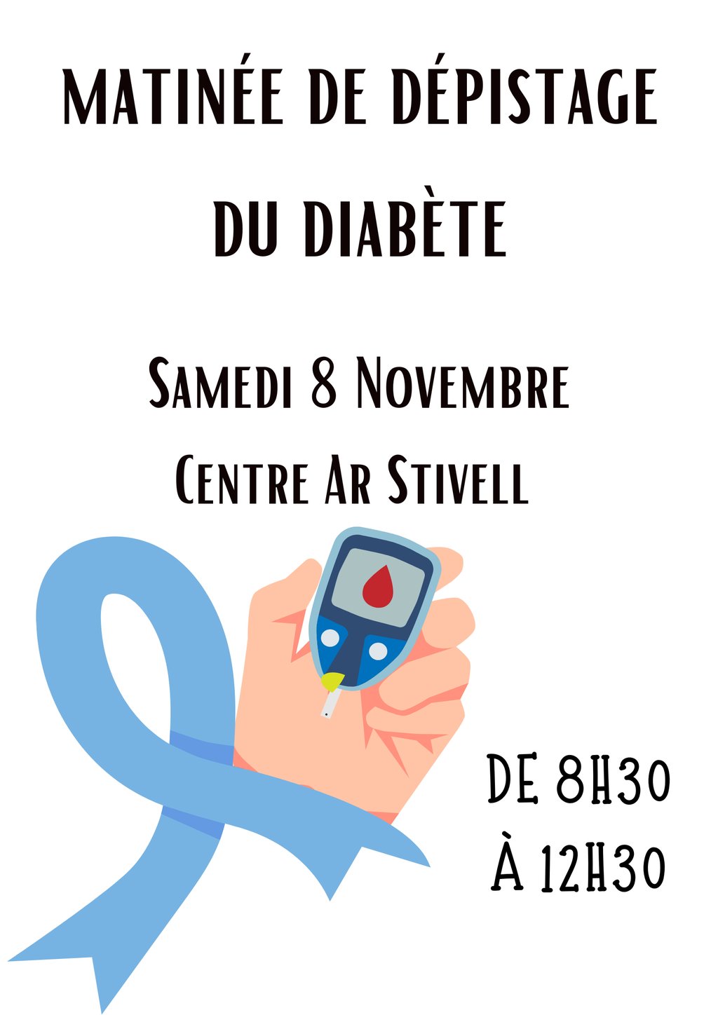 Une matinée de dépistage du diabète, organisée par le CCAS et l’association ADN29 (diabétiques du Nord Finistère), se tiendra Samedi 8 Novembre de 8 h 30 à 12 h, à la salle Ar Stivell.