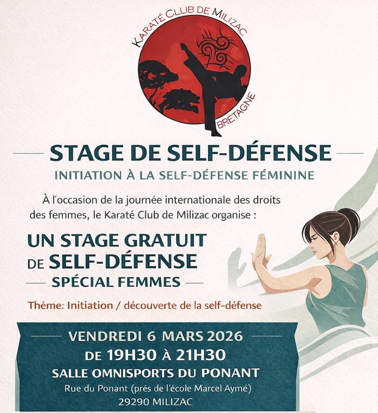 Comme chaque année, à l’occasion de la Journée internationale des droits des femmes, le Karaté Club de Milizac organise un stage gratuit de découverte de la self-défense. Ce stage se déroulera le Vendredi 6 Mars, de 19h30 à 21h30, à la salle des sports du Ponant.