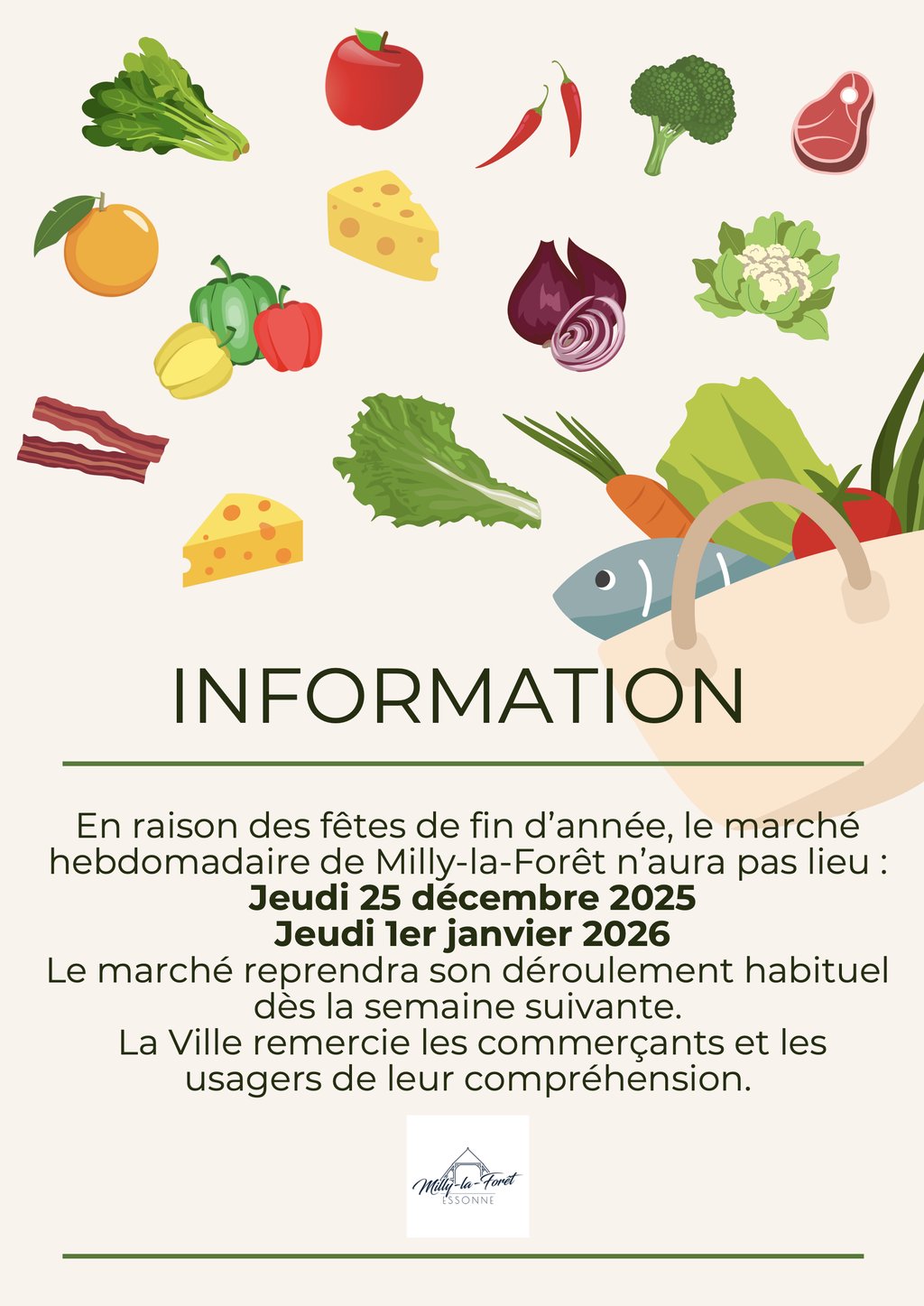 En raison des fêtes de fin d’année, le marché de Milly-la-Forêt sera exceptionnellement annulé les jeudis 25 décembre 2025 et 1er janvier 2026.