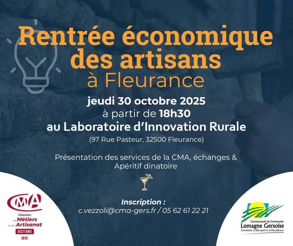 La Chambre de Métiers et de l'Artisanat du Gers vous donne rendez-vous jeudi 30 octobre à 18h30 au Laboratoire d'Innovation Rurale à Fleurance, pour vous informer sur ses services, échanger entre artisans et avec vos conseillers, et partager un moment convivial