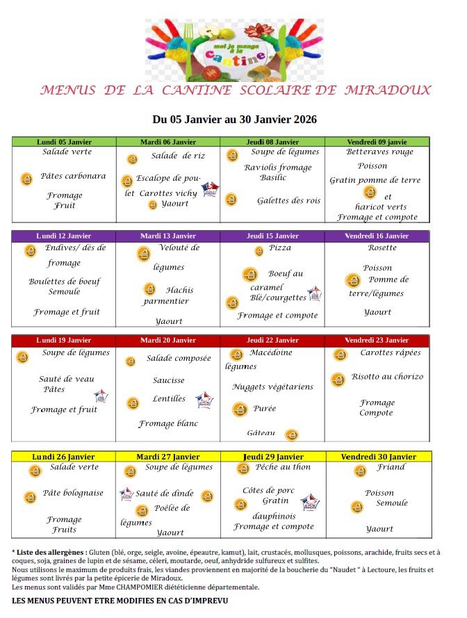 MENUS DE LA CANTINE SCOLAIRE DE MIRADOUX