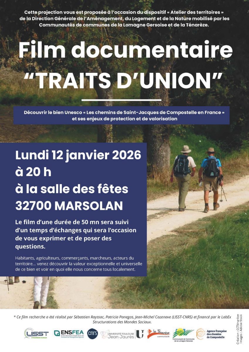 Film documentaire " TRAITS D'UNION" diffusé dans la salle des fêtes de Marsolan dans le Gers, le 12 janvier 2026 à 20h.